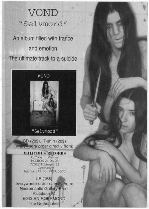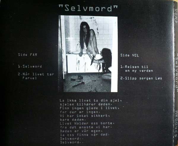 VOND’s “Selvmord” came out in the late autumn of 1994; the vinyl was produced by Necromantic Gallery Productions, and the CD edition by Malicious Records – who were also supposed to release “Født til å herske” on both formats.