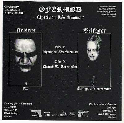 In May 1998, Nebrios’ label Pounding Metal released OFERMOD’s debut EP in five hundred copies. The seven-inch is adorned by the phrase ‘Orthodox Religious Black Metal’ – a term promoted by Belfagor in both online publications and traditional underground fanzines of the time. Shortly thereafter, Belfagor recruited bass player Mist, who was also a member of OPHTHALAMIA and MALIGN.
