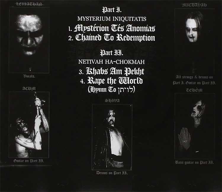 The CD edition of “Mystérion Tés Anomias” – released by and dedicated to French label NoEvDia – came out in March 2005. Its booklet was designed by Timo Ketola, who helped shape the visual representation of bands like FUNERAL MIST, WATAIN, KAAMOS, and DEATHSPELL OMEGA.