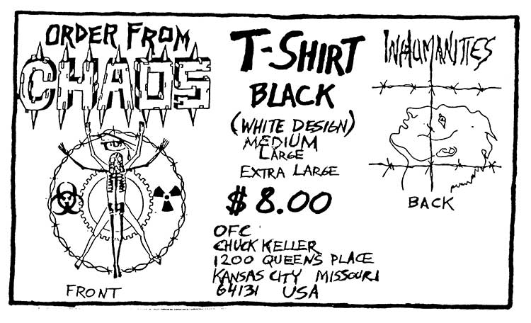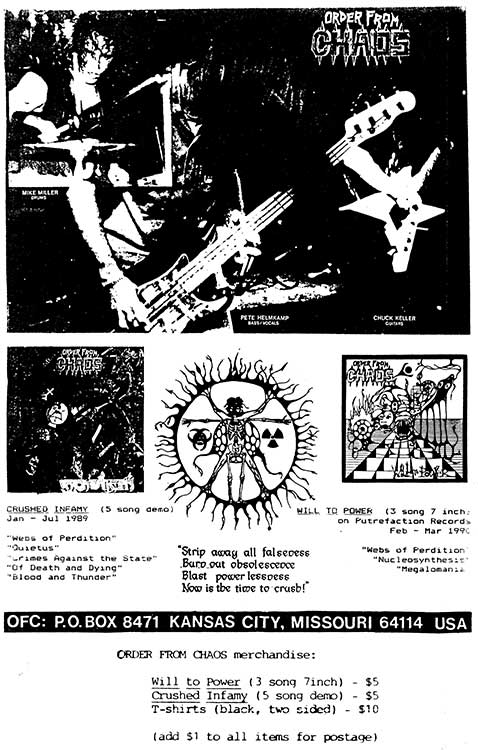 The following month, ORDER FROM CHAOS finished mixing “Crushed Infamy” and self-released it on cassette. Chuck still worked at the record shop, utilising their heavy-duty copy machine to produce and distribute O.F.C. flyers.