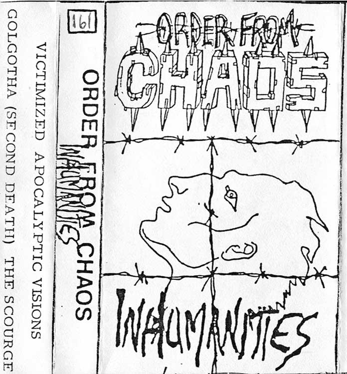 In July 1988, half a year after “Demo 1”, ORDER FROM CHAOS recorded their second demo, “Inhumanities”. Presenting a significantly more death metal-scented sound, it features a new rendition of “The Scourge” plus three new songs, the shortest of which is five and a half minutes.
