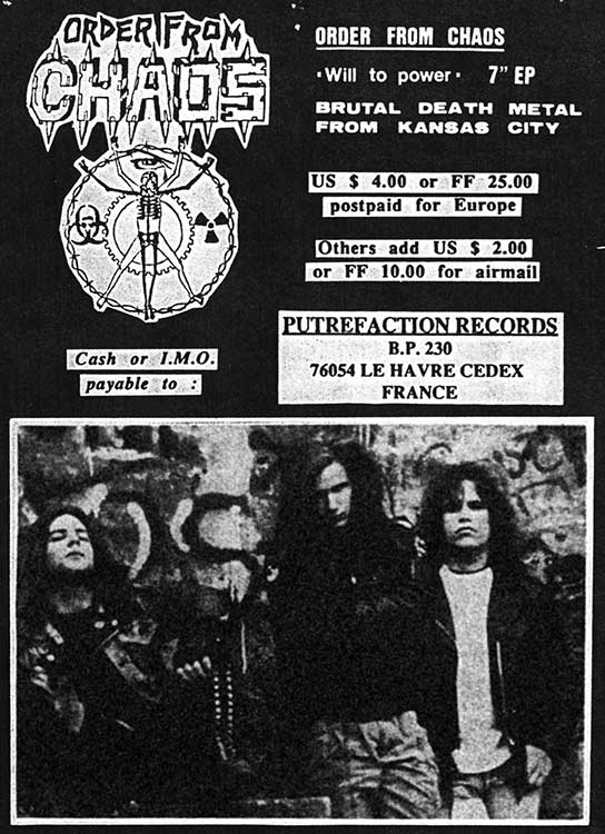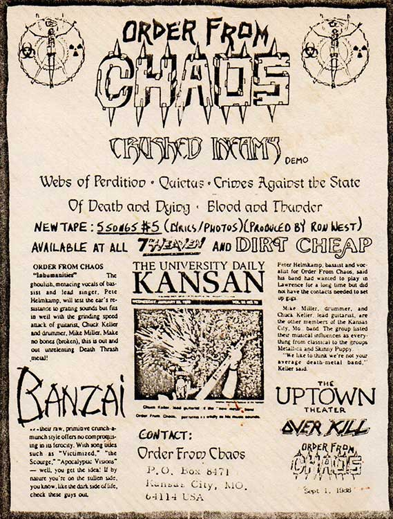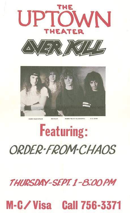 Two months later, ORDER FROM CHAOS made their stage debut by opening for American thrash veterans OVERKILL at the Uptown Theater in Kansas City. Not bad for a band that hadn’t even existed a full year.