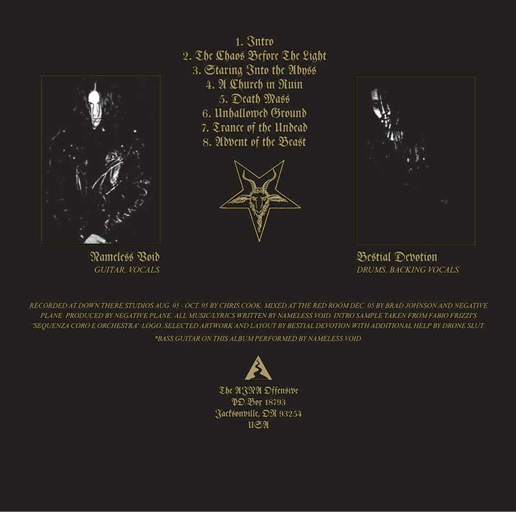 In the fall of 2005, Tyler Davis of The Ajna Offensive – an Oregon-based label that had recently signed NEGATIVE PLANE – published an interview with Nameless Void. The piece delved into the band’s philosophies and future plans whilst also stressing the importance of their Satanic beliefs.