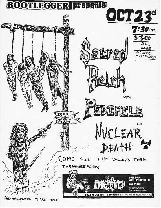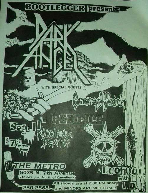 The earliest NUCLEAR DEATH show I’ve identified took place in the fall of 1986, at The Metro in Phoenix, with DARK ANGEL.