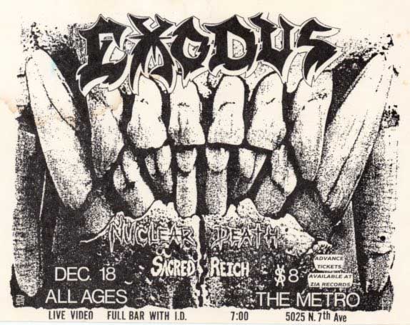 The following weekend, NUCLEAR DEATH returned to The Metro and played with two local acts, SACRED REICH and PEDIFILE. Then, as their final show of 1986, they opened for EXODUS – another prestigious slot for a demo band.
