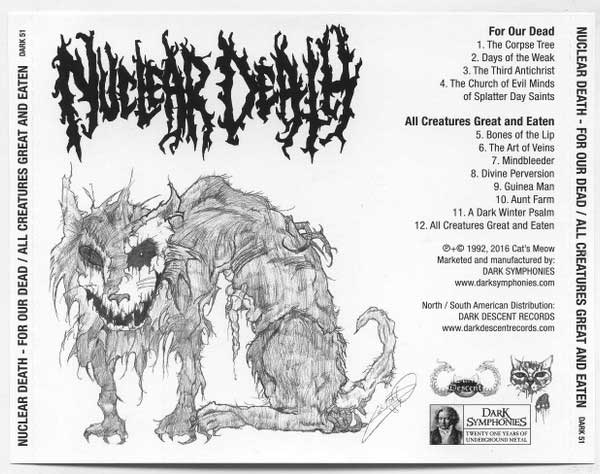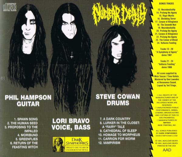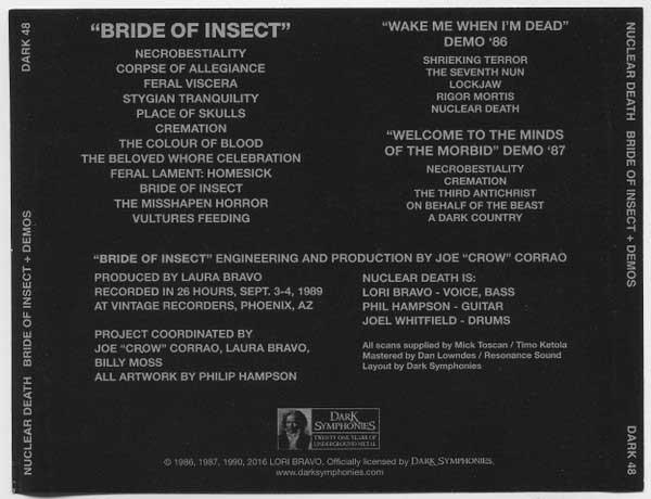 In early 2016, American underground label Dark Symphonies re-issued NUCLEAR DEATH’s “Bride of Insect,” “Carrion for Worm,” and “…For Our Dead… / All Creatures Great and Eaten”. Lori’s initial reaction upon receiving the band’s share was stunned disbelief.