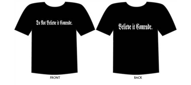 JON: Regardless, it stuck as a forum slogan, which both J.B. and I found hilarious. Someone eventually suggested official F.M.P. merch – ‘Do Not Believe it, Comrade’ on the front, ‘Believe it, Comrade’ on the back <laughs>. We printed a hundred shirts, and they sold out right away.