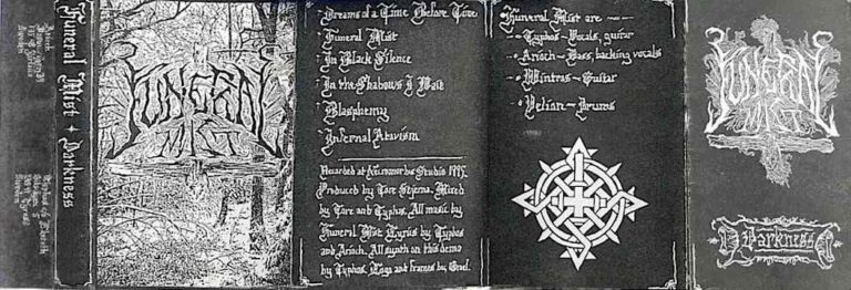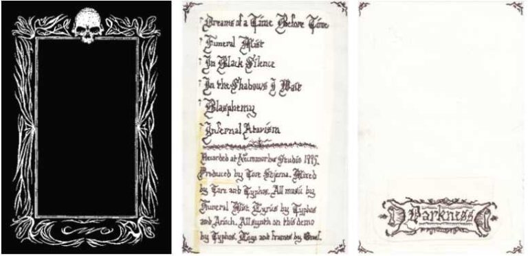 The J-card for FUNERAL MIST’s 1995 tape “Darkness” has an entirely analogue feel. At a time when almost every Swedish demo featured digital text, this one was completely handwritten.