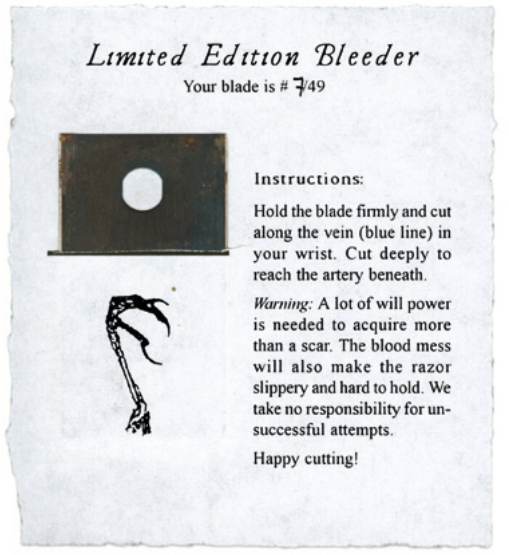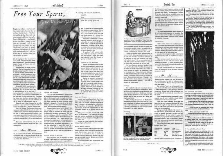 Dauthus #2 appeared in January 1998. The first forty-nine copies included a razor blade, complete with instructions on how to use it – noting that ‘a lot of willpower is needed to acquire more than a scar’. Further guidance followed in Timo’s three-page illustrated article Free Your Spirit: A Survey on Suicide Methods, Death, and the Decaying Process.